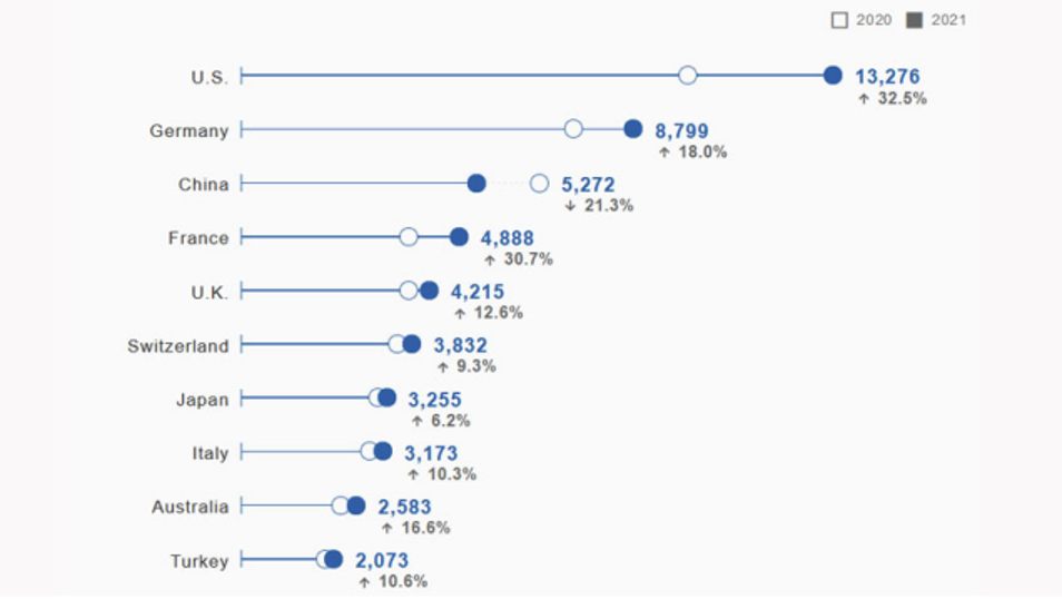 2021 年,美國申請人提交的國際商標申請數(shù)量最多(總計13,276 件),同比2020年增長 32.5%。